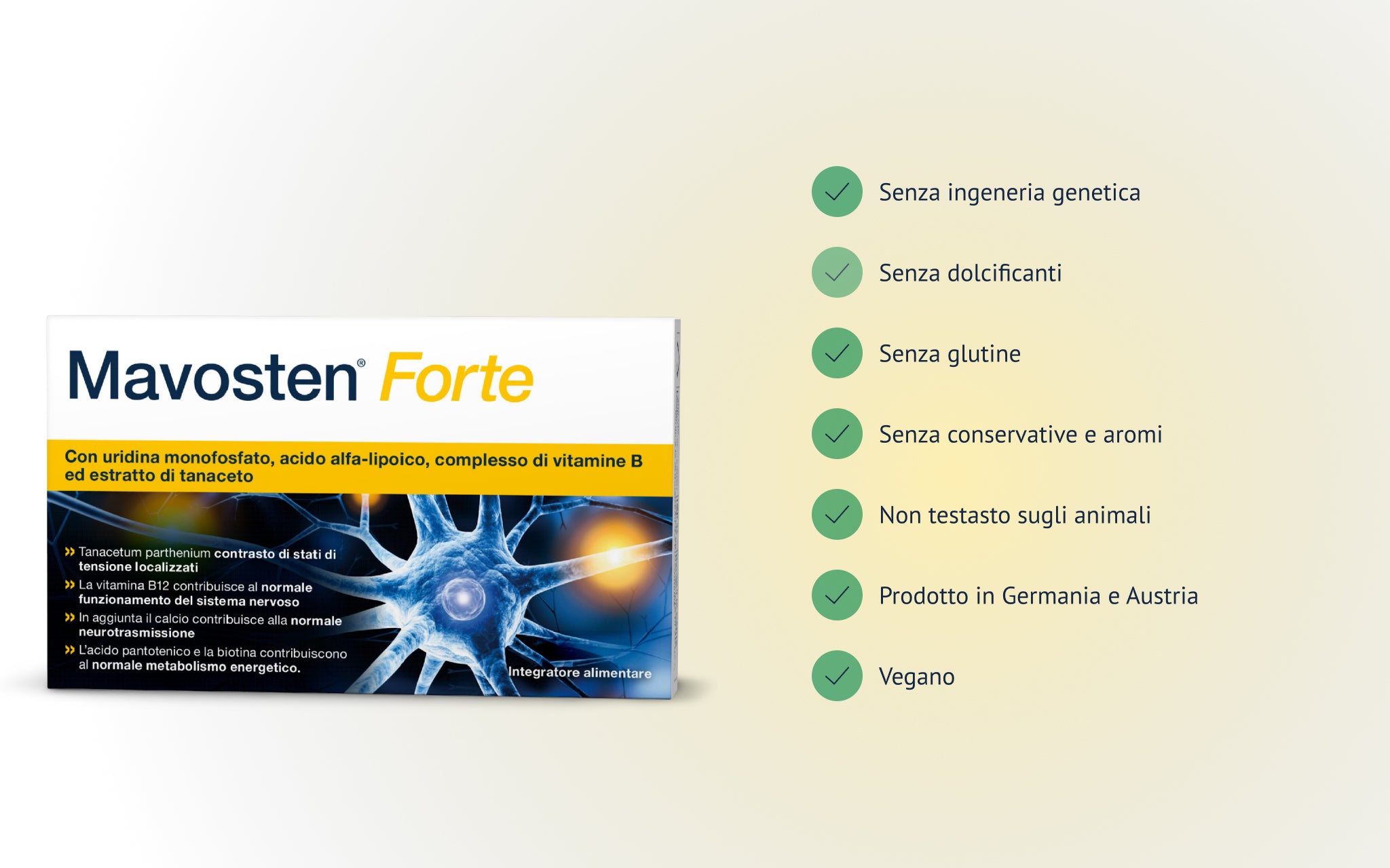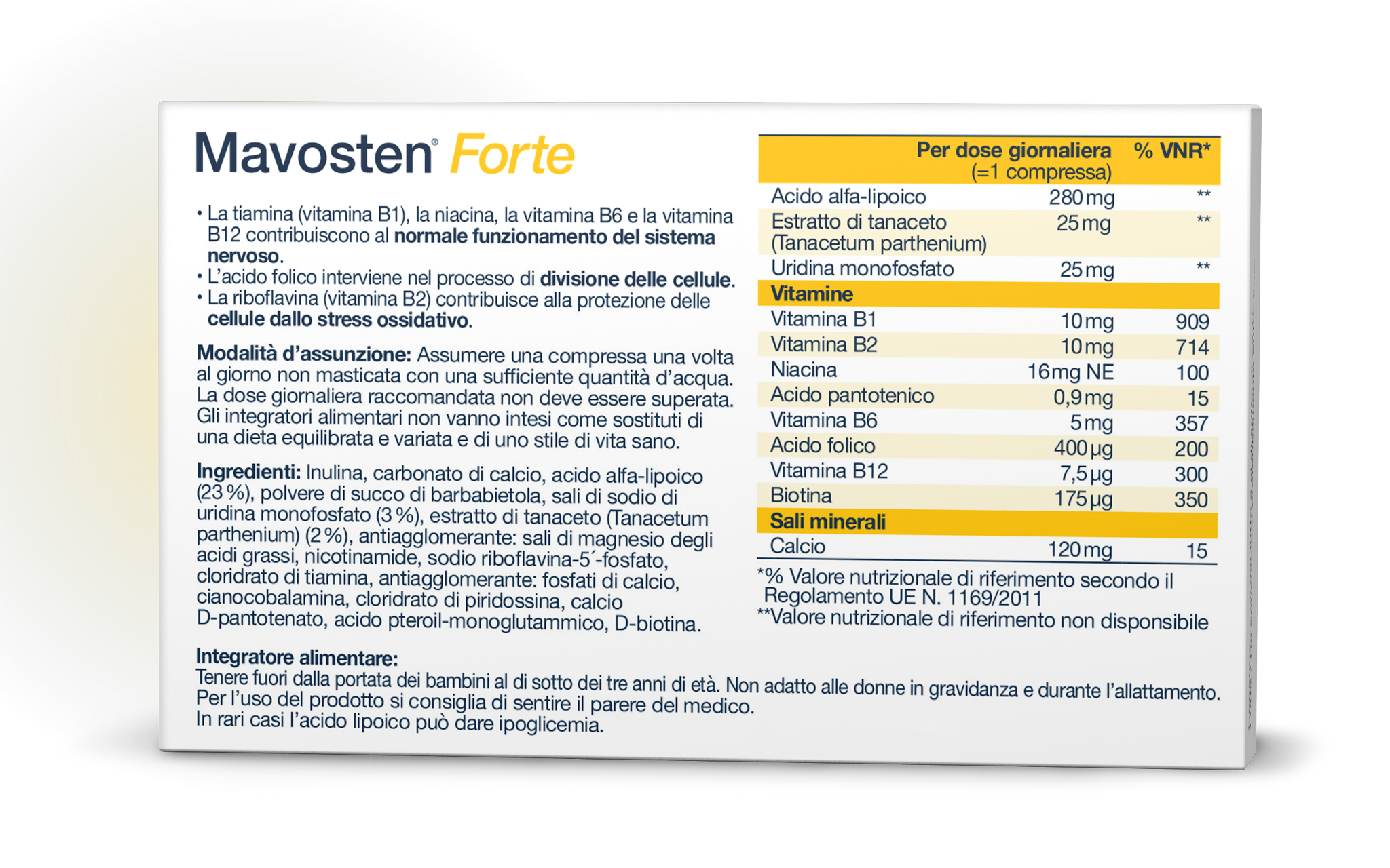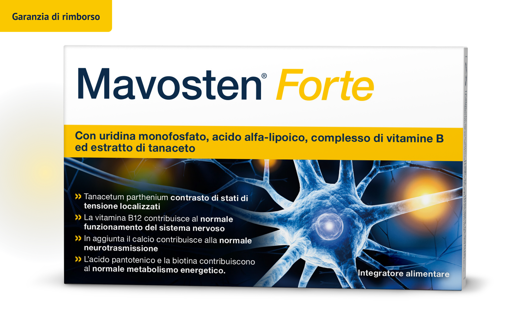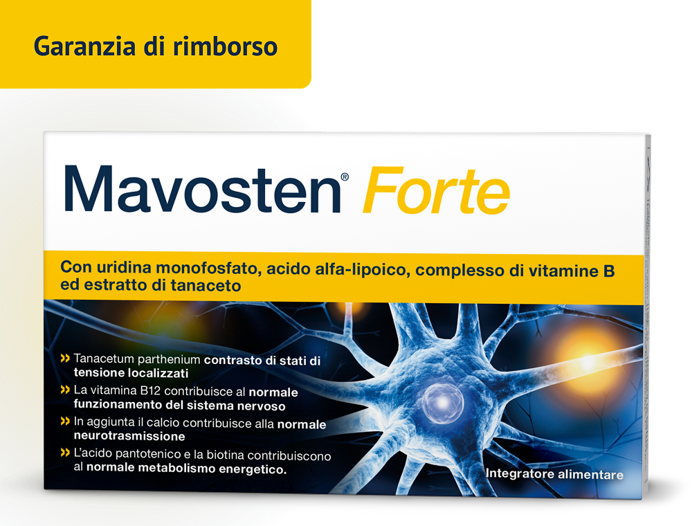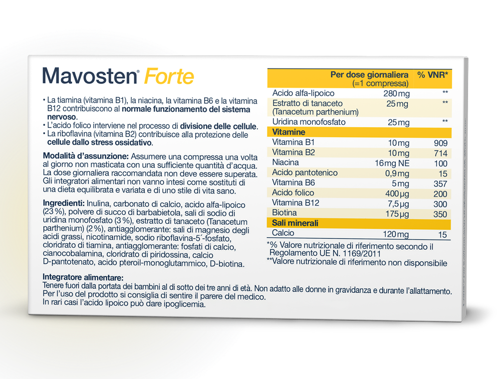 Mavosten® Forte è un integratore alimentare di alta qualità che, per la prima volta, combina il comprovato nutriente Acido Alfa-Lipoico (ALA) con l'intero complesso vitaminico B, il calcio, l'Uridina Monofosfato (UMP) e l'estratto di Tanacetum.
