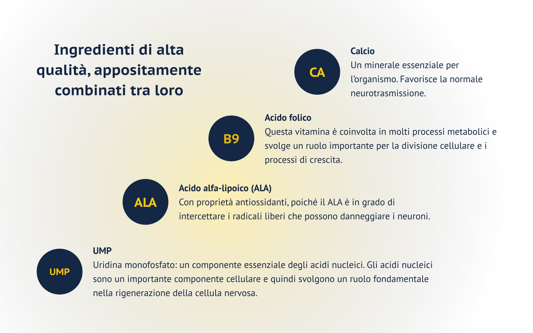 • Uridina Monofosfato (UMP) è un componente essenziale degli acidi nucleici. Gli acidi nucleici sono un elemento chiave delle cellule e svolgono un ruolo fondamentale nella rigenerazione delle cellule nervose.