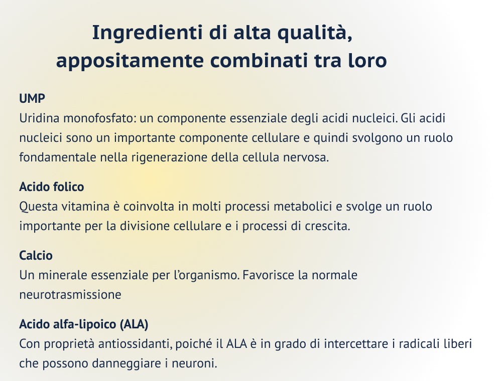 • Con Uridina Monofosfato, un componente essenziale per la salute dei nervi