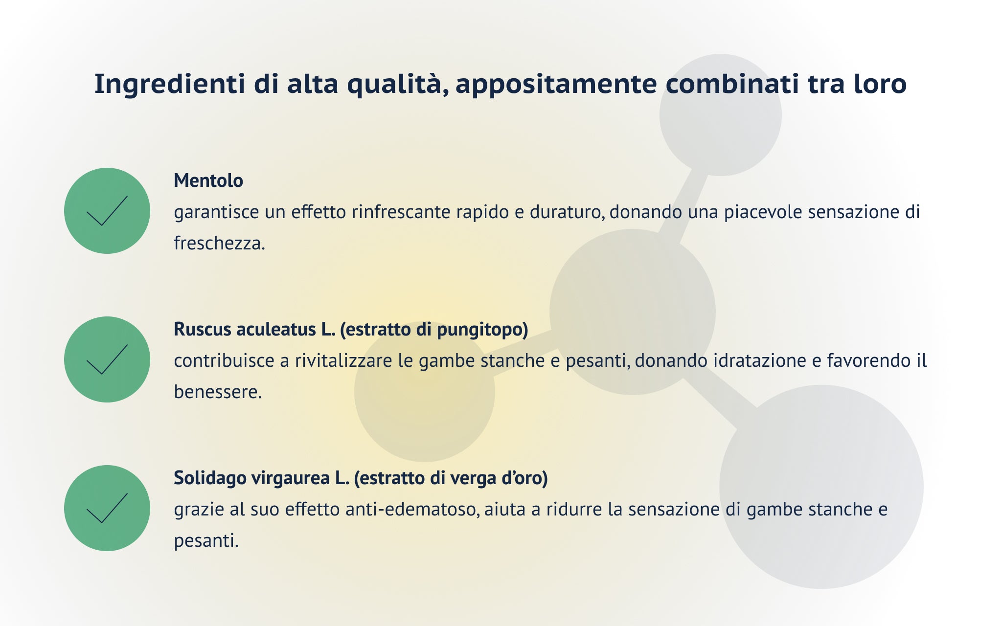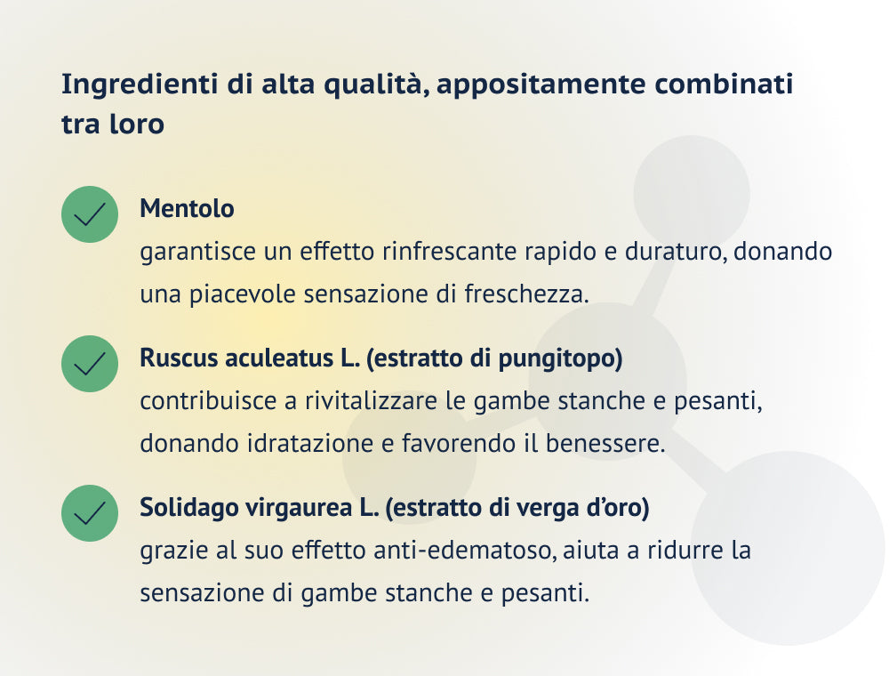 - Supporto alla microcircolazione e riduzione degli edemi grazie al massaggio con il complesso di estratti vegetali triplo LEGACTIF™