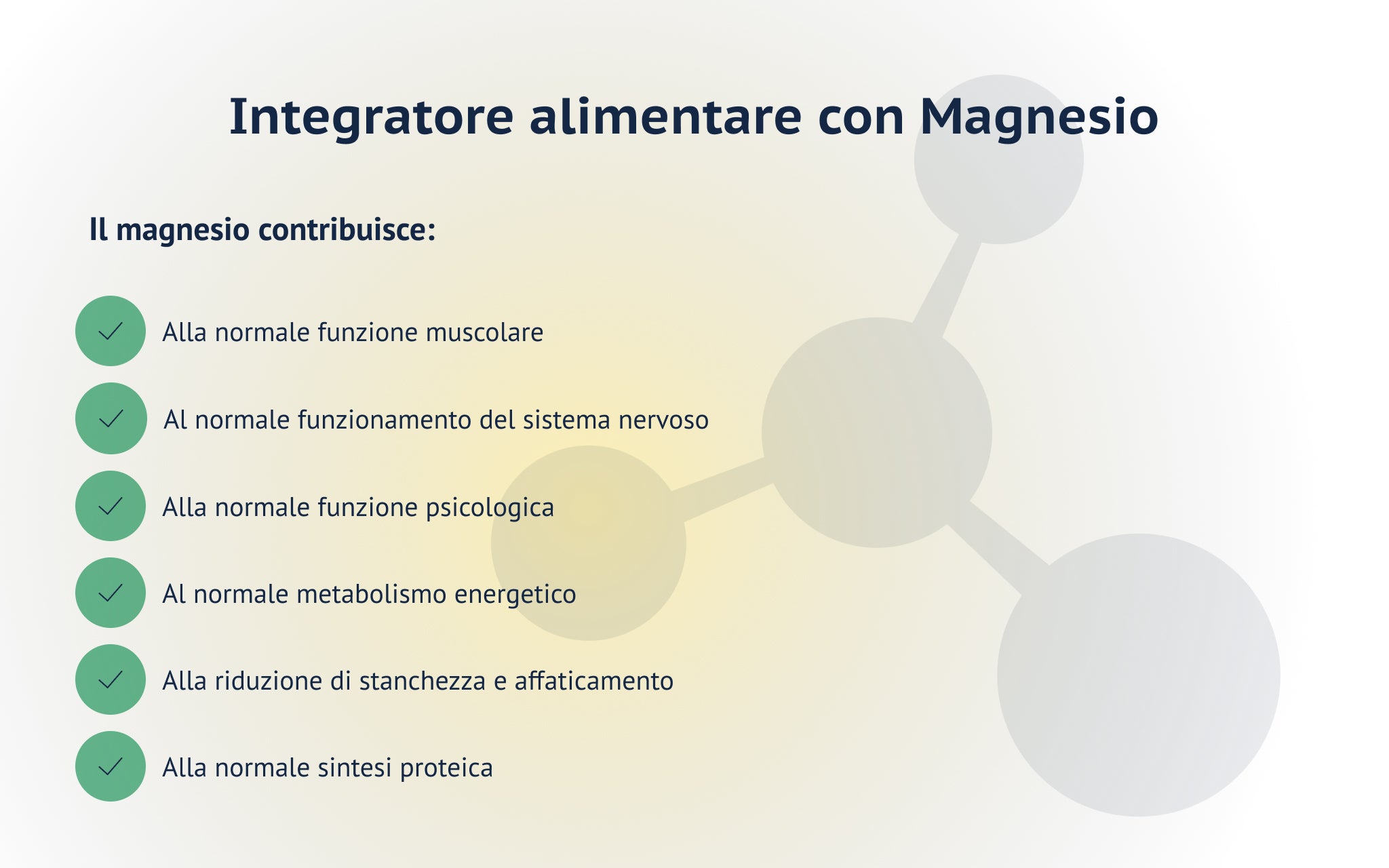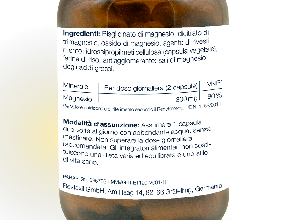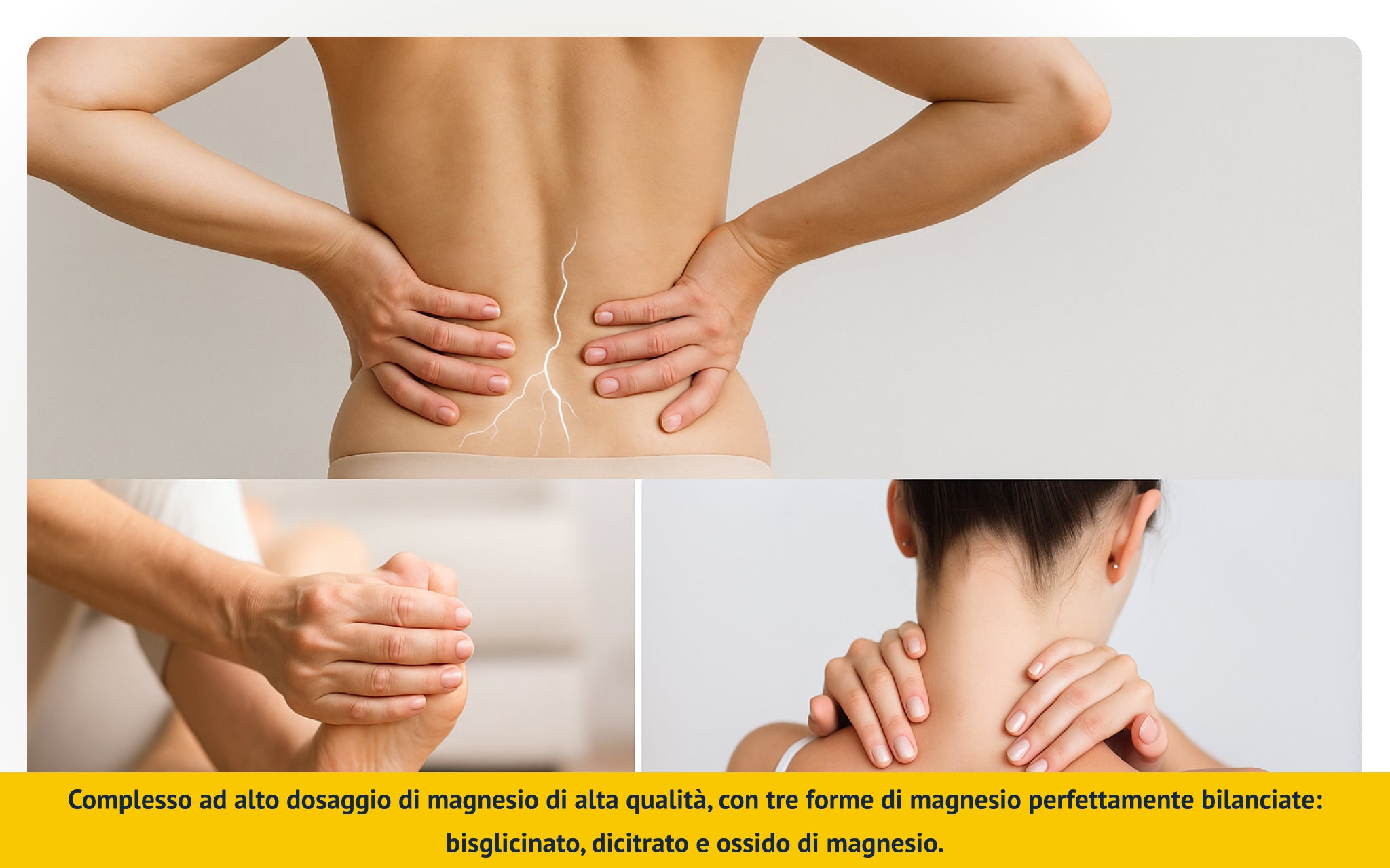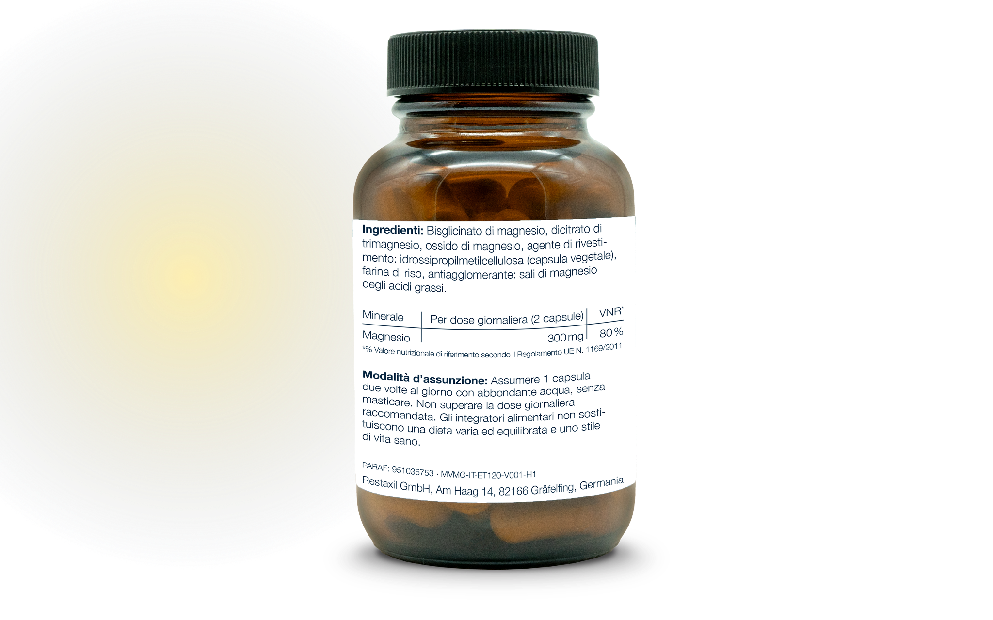 - Tre forme di magnesio perfettamente bilanciate: magnesio bisglicinato, trimagnesio dicitrato e ossido di magnesio